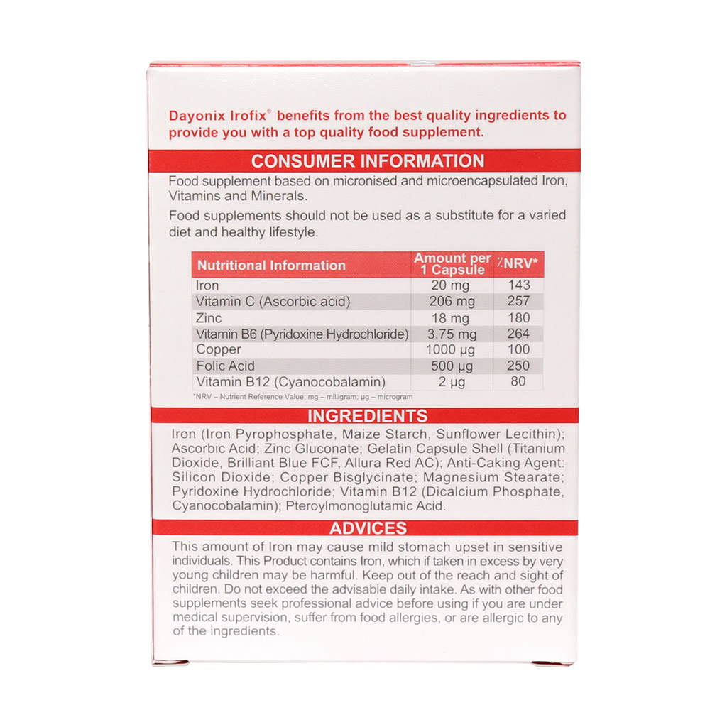 وجود آهن به صورت لیپوزومال در کپسول آیروفیکس دایونیکس فارما، جذب آهن را افزایش داده و عوارض گوارشی آن را کاهش میدهد. علاوه بر آهن، آیروفیکس دایونیکس حاوی ویتامینهای گروه B، روی و مس نیز بوده است.