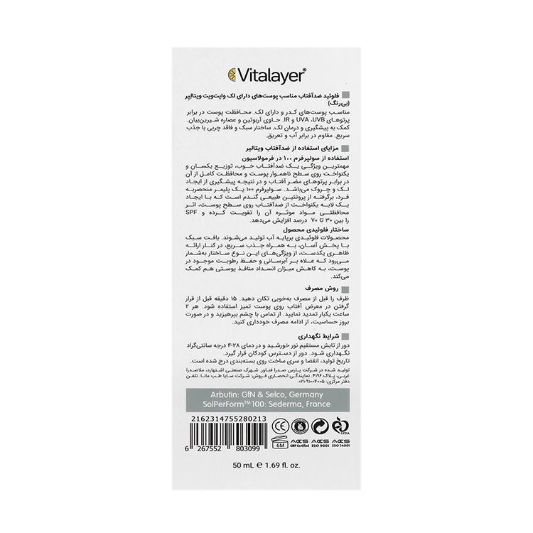 فلوئید ضد آفتاب و ضد لک ویتالیر با ترکیبات پیشرفته، پوست شما را در برابر اشعههای مضر UVA، UVB و IR محافظت میکند. این محصول حاوی آربوتین و عصاره شیرین بیان، دو ترکیب قدرتمند روشنکننده و ضد لک، است که به طور موثر لکها و تیرگیهای پوست را کاهش میدهد. با بافت سبک و جذب سریع، به راحتی روی پوست پخش میشود و بدون ایجاد چربی، رطوبت پوست را حفظ میکند. مقاومت در برابر تعریق و شستشو، اطمینان از محافظت مداوم پوست را فراهم میکند. همچنین، با کاهش انسداد منافذ، از بروز جوش و آکنه جلوگیری کرده و به روشن شدن و یکدست شدن رنگ پوست کمک میکند.