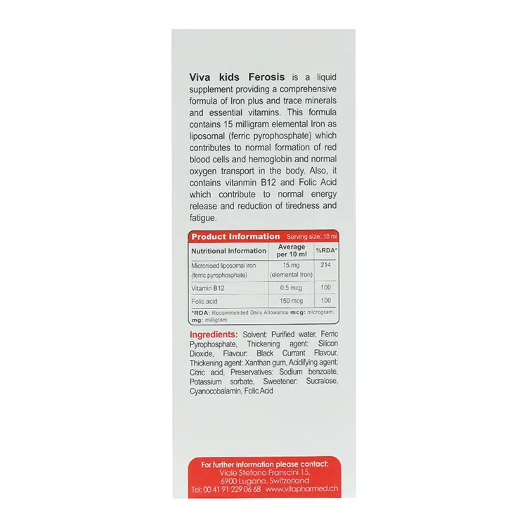 شربت فروسیس لیپوزومال ویواکیدز با فرمولاسیون غنی از آهن، فولیک اسید و ویتامین B12، یک مکمل غذایی کامل برای پیشگیری و درمان کم‌خونی در کودکان و بزرگسالان به شمار می‌رود. آهن موجود در این شربت به صورت لیپوزومال بوده و به راحتی جذب بدن می‌شود. این مکمل علاوه بر افزایش انرژی و بهبود عملکرد ذهنی، به تقویت سیستم ایمنی بدن و کمک به رشد و تکامل کودکان نیز کمک می‌کند. فولیک اسید و ویتامین B12 موجود در این شربت نیز در ساخت گلبول‌های قرمز و سلامت مغز نقش مهمی ایفا می‌کنند.