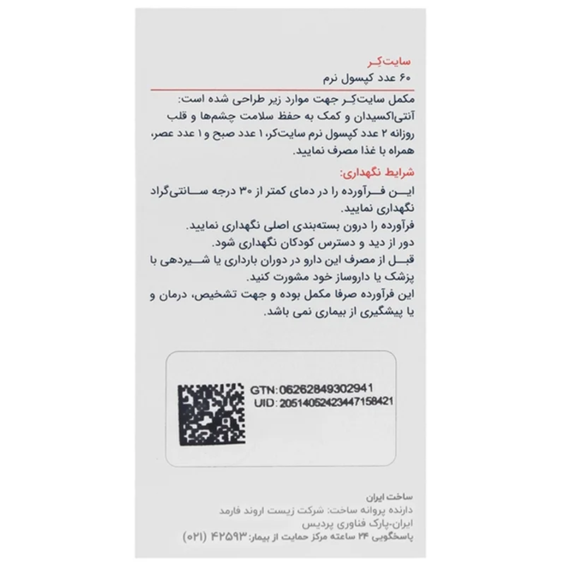 کپسول سایت کر ، یک مکمل غذایی جامع و غنی است که با ترکیبی قدرتمند از آنتی‌اکسیدان‌های لوتئین و زیزانتین، ویتامین‌های ضروری C و E، عناصر معدنی مهم مانند زینک و مس، و کوآنزیم انرژی‌زا کیوتن، به بهبود چشمگیر سلامت قلب و چشم کمک می‌کند.