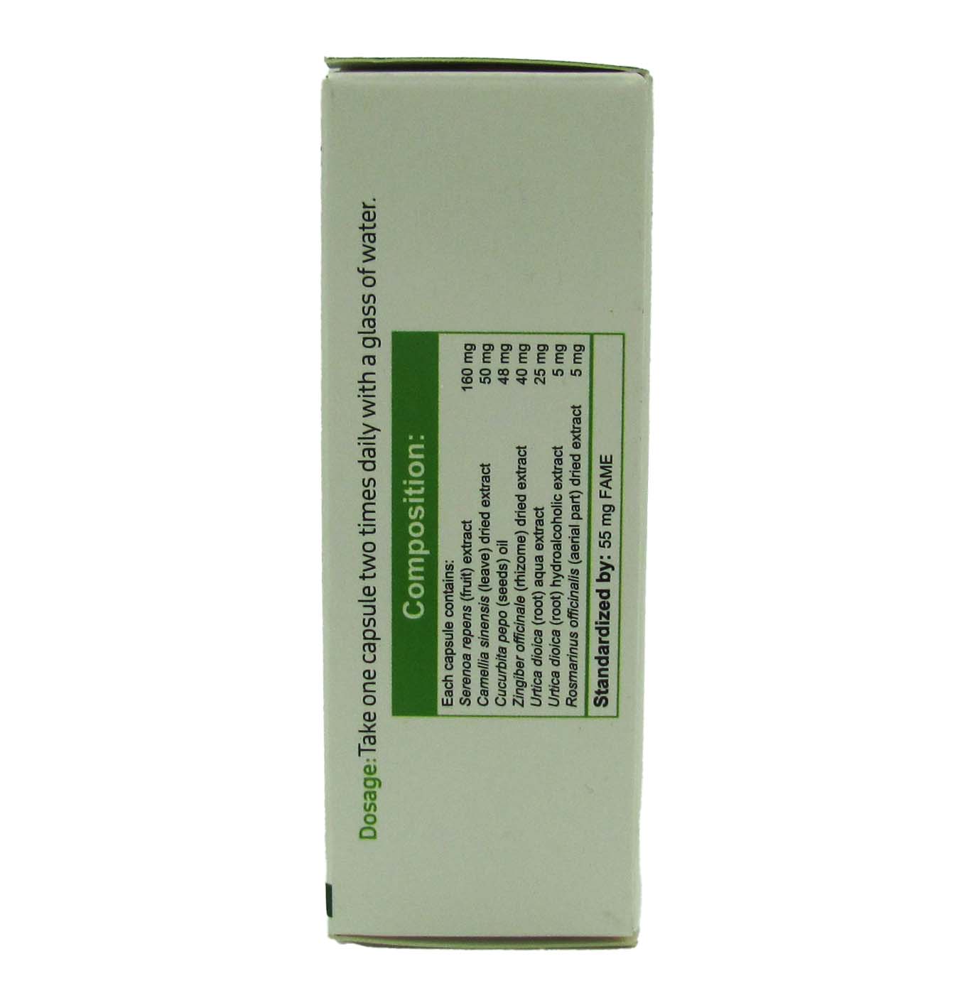 ترکیبات:عصاره میوه نخل ارهای،عصاره خشک برگ چای سبز،روغن دانه کدو،عصاره خشک ریشه زنجبیل،عصاره آبی ریشه گزنه،عصاره هیدروالکلی ریشه گزنه،عصاره خشک اندام هوایی گیاه رزماری است.