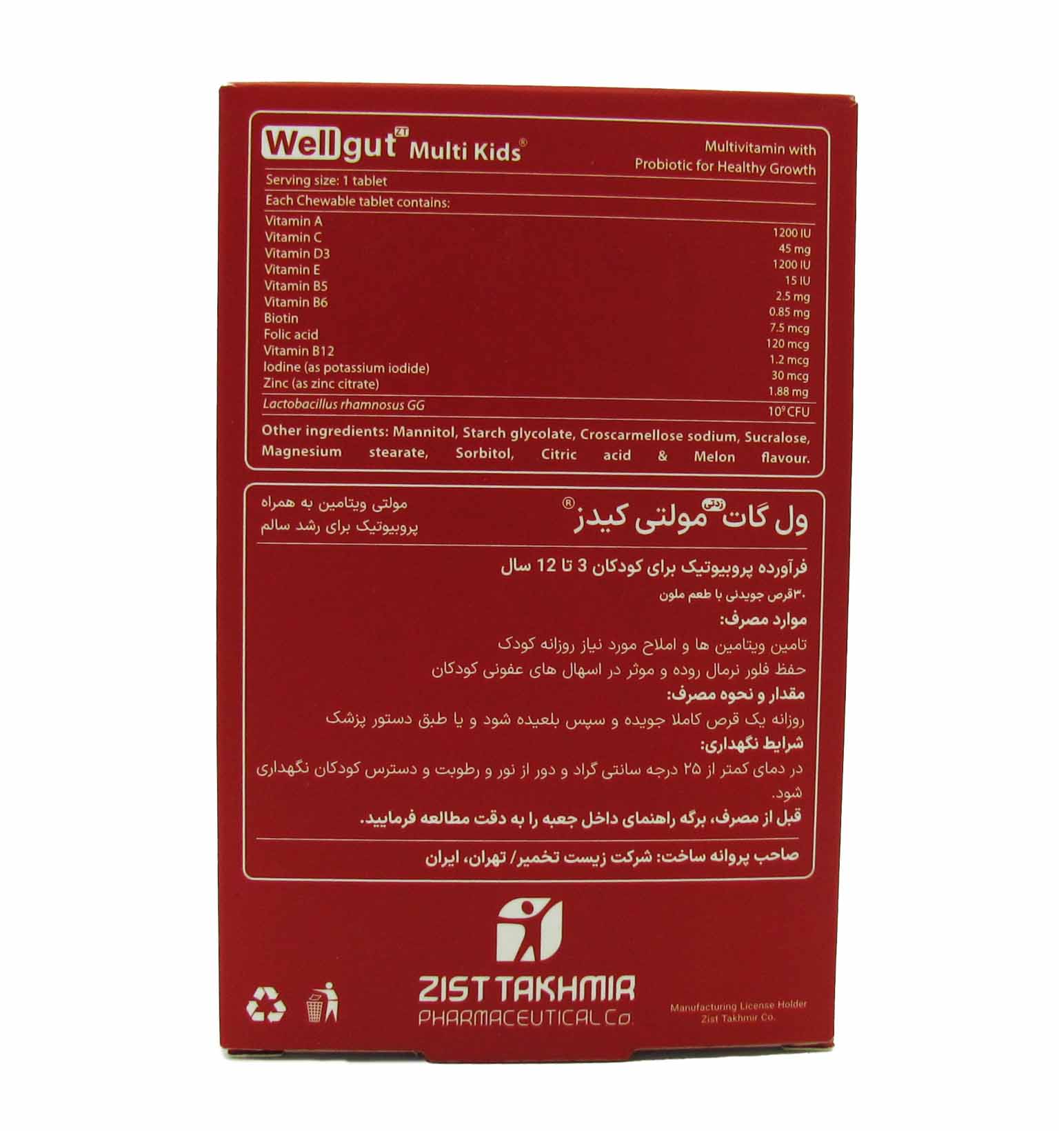 قرص جویدنی ول گات مولتی کیدز با ترکیب پروبیوتیک، ویتامینها و مواد معدنی ضروری مانند روی و ید، به حفظ تعادل باکتریهای مفید روده، بهبود هضم و جذب مواد مغذی، تقویت سیستم ایمنی و کاهش علائم اسهال کمک میکند. ول گات مولتی کیدز بدون گلوتن، لاکتوز و قند اضافه بوده و به راحتی توسط کودکان قابل مصرف است. این محصول توسط شرکت زیست تخمیر در ایران تولید میشود.